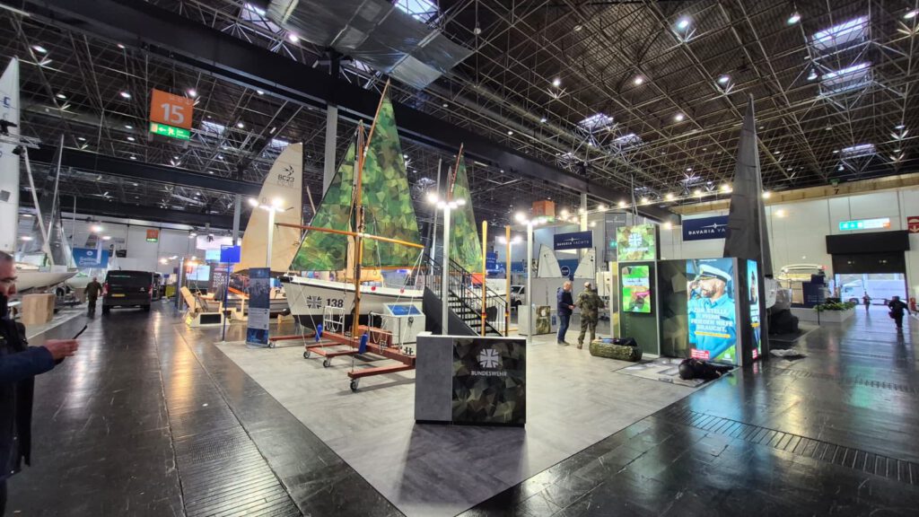 Sie ist die größte Wassersportmesse der Welt: die „boot“ in Düsseldorf. Auf einem guten Platz in Halle 15 steht ein mit Segeln in Tarndruck aufgeriggter Marinekutter der Marineuntersoffizierschule in Plön. Das Boot unterstützt die Kieler Ansprechpartner bei allen Fragen, die zur kommenden Marinekutterregatta 2026 aufkommen können. Super Werbung – und wer noch Zeit hat, nach Düsseldorf zu fahren, ist herzlich eingeladen, am Stand A24 vorbeizuschauen.